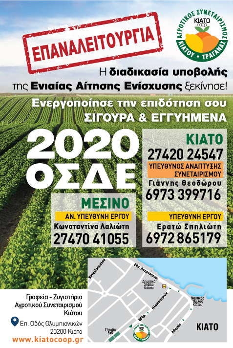 Προκειμένου να μην υπάρξει η παραμικρή καθυστέρηση και να μην δημιουργηθεί κανένα πρόβλημα, ο Αγροτικός Συνεταιρισμός Κιάτου Τραγάνας, σεβόμενος τις οδηγίες που έχει δώσει το Υπουργείο και ο ΟΠΕΚΕΠΕ, κάνει την προετοιμασία ώστε να είναι έτοιμη η δήλωση μετά την λήξη των έκτακτων μέτρων διευκολύνοντας όχι μόνο τους αγρότες αλλα και το συνεταιρισμό, ώστε να ολοκληρωθεί το ΟΣΔΕ του 2020 χωρίς πρόσθετα προβλήματα.